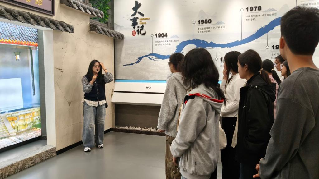 活动当天,校史馆讲解员提前做好准备,以清晰的逻辑、生动的语言为新生们搭建起“穿越时空的校园对话”。步入馆内,新生们首先聚焦于“校园发展大事年表”展区,在讲解员的细致解读下,顺着时间轴线回溯汉江师范学院的百年历程——从 1904 年郧阳府师范学堂创办、开启鄂西北地区师范教育先河,到1950年由李先念同志签署政府令转为公办院校,再到1978年开启高等教育发展新阶段、后续稳步推进内涵建设……一张张泛黄的历史照片、一段段详实的文字记载,让新生们直观感受到学校在不同历史时期的使命担当与发展成就,现场不时响起轻声赞叹。