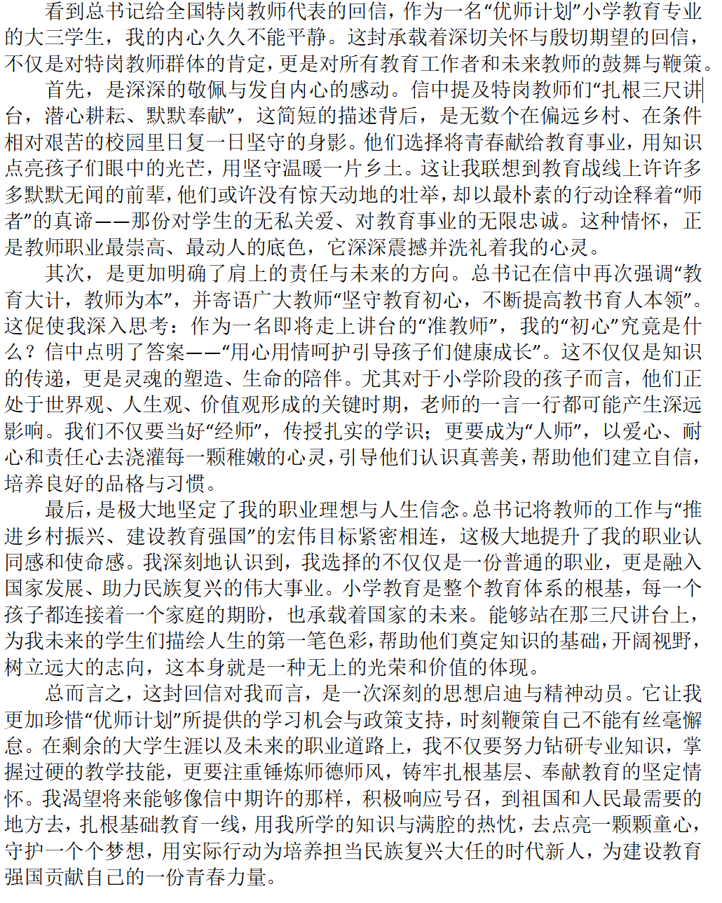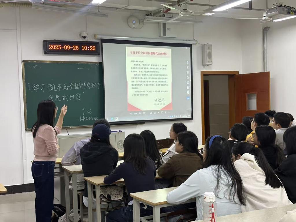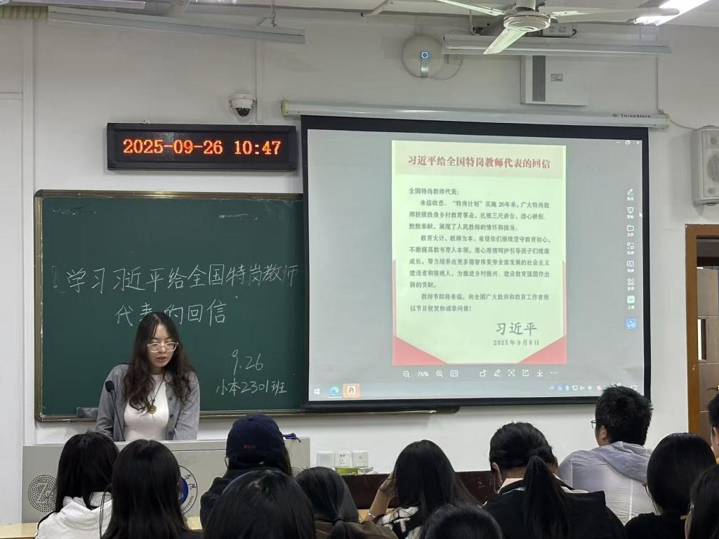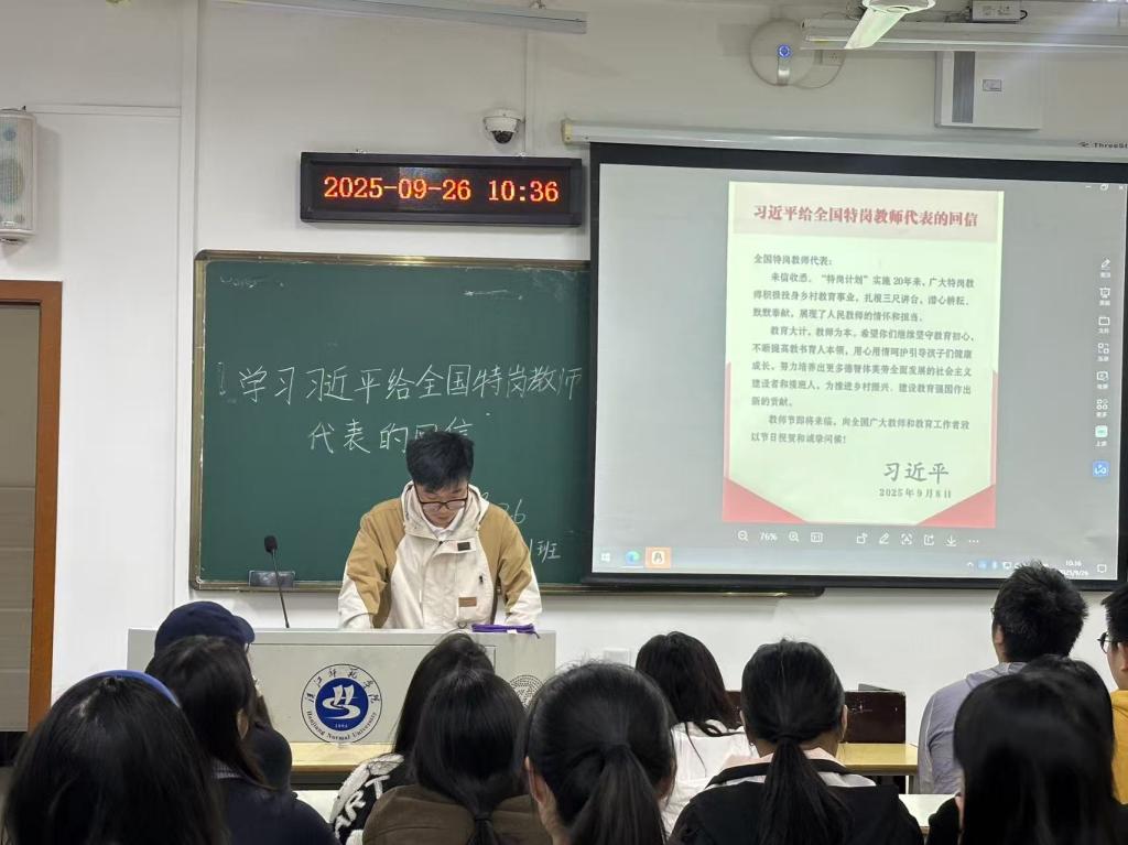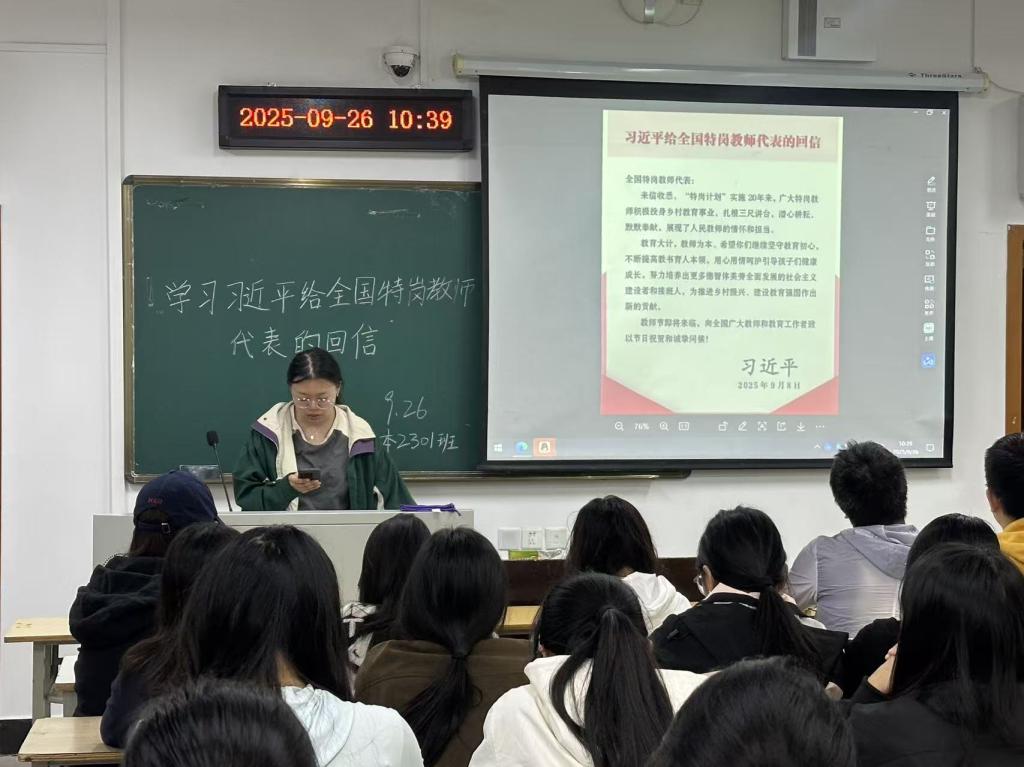 班长付梦圆同学向全班同学介绍了习近平总书记于2025年9月8日给全国特岗教师代表的回信全文。信中,总书记充分肯定了“特岗计划”实施20年来广大特岗教师投身乡村教育、默默奉献的担当精神,并寄语教师们坚守初心、提升本领,为培养德智体美劳全面发展的社会主义建设者和接班人、推进乡村振兴和教育强国建设作出新贡献。