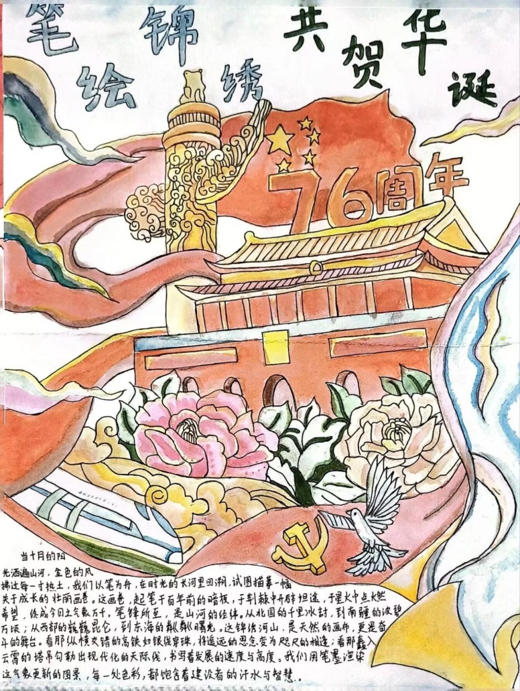 活动一经启动,便得到各班级积极响应。同学们热情参与、才华横溢,将浓浓的爱国情怀与对中华民族共同体的深刻认同巧妙融合于创作之中。斑斓画笔之下,天安门、五星红旗、华表、祥云等富有象征意义的元素跃然纸上,勾勒出一幅幅国泰民安、繁荣昌盛的盛世图景;真挚文字之间,既有对祖国辉煌历程的深情回顾,也有对新时代奋进征程的美好祝愿。