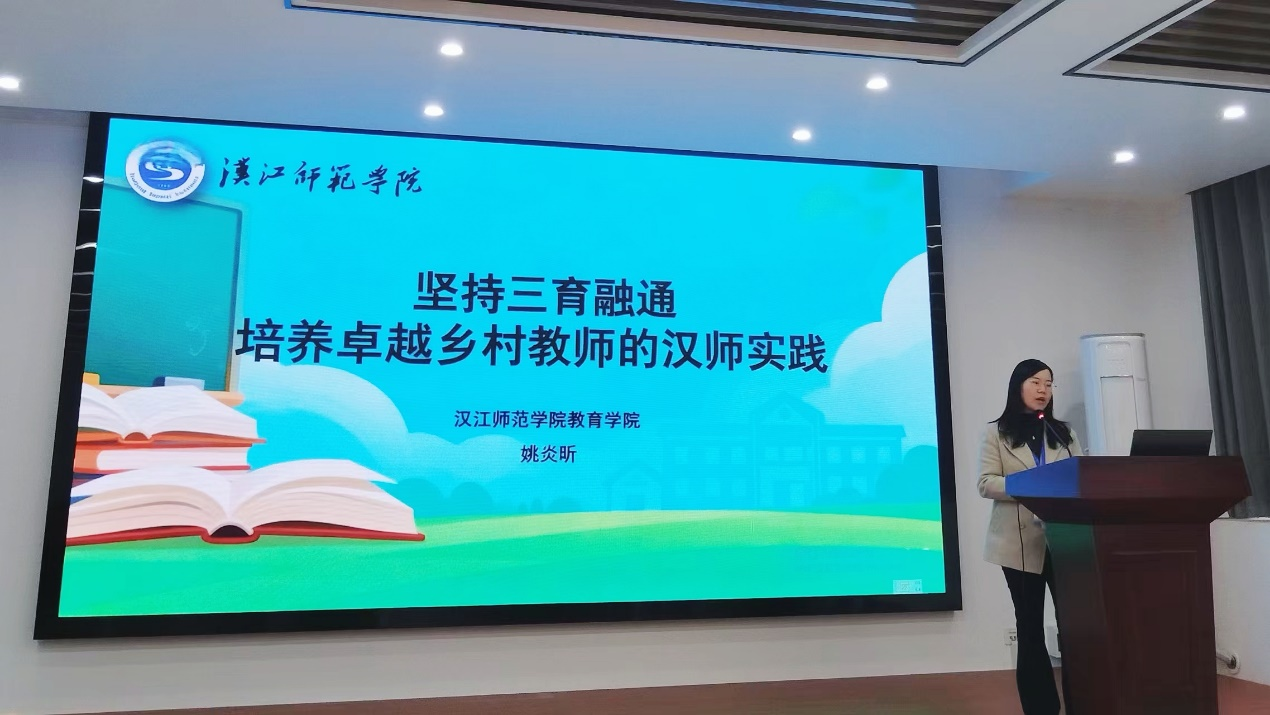 姚炎昕以“坚持三育融通培养卓越乡村教师的汉师实践”为题,从体系建构、实践探索和未来展望三个维度,全面且深入地阐释了我校在卓越乡村教师培养领域取得的主要成果、积累的宝贵经验以及未来的发展规划。