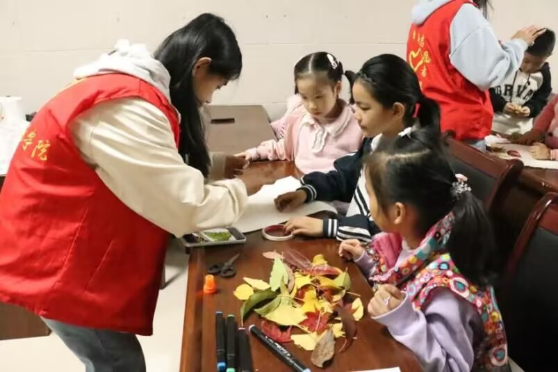 本次活动通过简笔画教学与落叶画艺术创作两大核心板块,既让孩子们的想象力和动手能力得到有效锻炼,也让教育学院“新六艺” 的独特魅力在实践中自然流露。活动伊始,志愿者先引导孩子们自由创作简笔画,快速吸引大家的注意力,随后通过细致教学,教会孩子们绘制兔子、老鼠等形象,让孩子们直观感受艺术的乐趣。进入互动环节,志愿者们组织看图猜物游戏,在锻炼孩子们语言表达能力与记忆力的同时,还设置了加分制 —— 表现认真的孩子可获得印章,印章数量领先者能兑换小礼品,充分调动了孩子们的参与热情。活动最后,志愿者们顺势引出落叶创作主题,耐心指导孩子们利用天然落叶进行艺术创作,在志愿者的协助下,孩子们纷纷完成了树木、月亮等精美的画作。从最初的羞怯犹豫到后来大胆表达自己的想法,孩子们在全程沉浸于探索与创造的乐趣中。“我一开始画的好丑,但之后发现我可以画的更好。” 一位孩子兴奋地分享自己的收获。