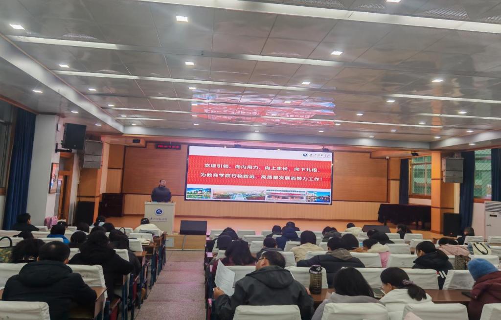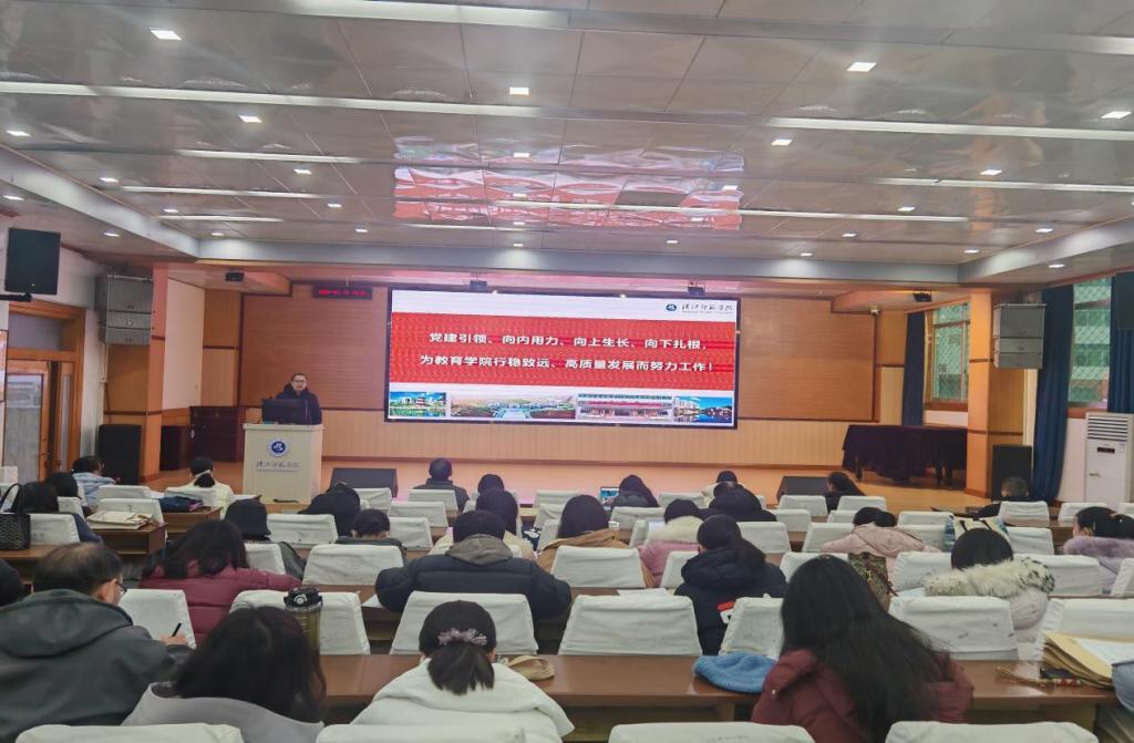 2026年1月18日上午9:00,教育学院2025-2026学年第一学期全体教职工大会暨2026年汉江师范学院第二届教职工代表大会第一次预备会在西校区C101报告厅召开。学院全体党政领导班子成员、全体教职工参加会议,共商学院发展大计,凝聚奋进力量,共绘发展蓝图。会议由教育学院分党委书记曹赟主持。