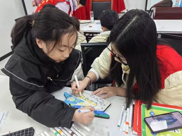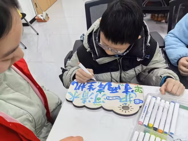 理论知识讲解结束后,“变废为宝·创意标牌”制作环节正式展开。志愿者肖雪怡结合生活实例,向同学们讲述了废旧物品回收利用的价值与意义,并展示了用废弃木板、塑料瓶、旧卡纸等材料制作的环保标牌样品,启发大家发挥创意,将“无用”之物转化为传递环保理念的载体。