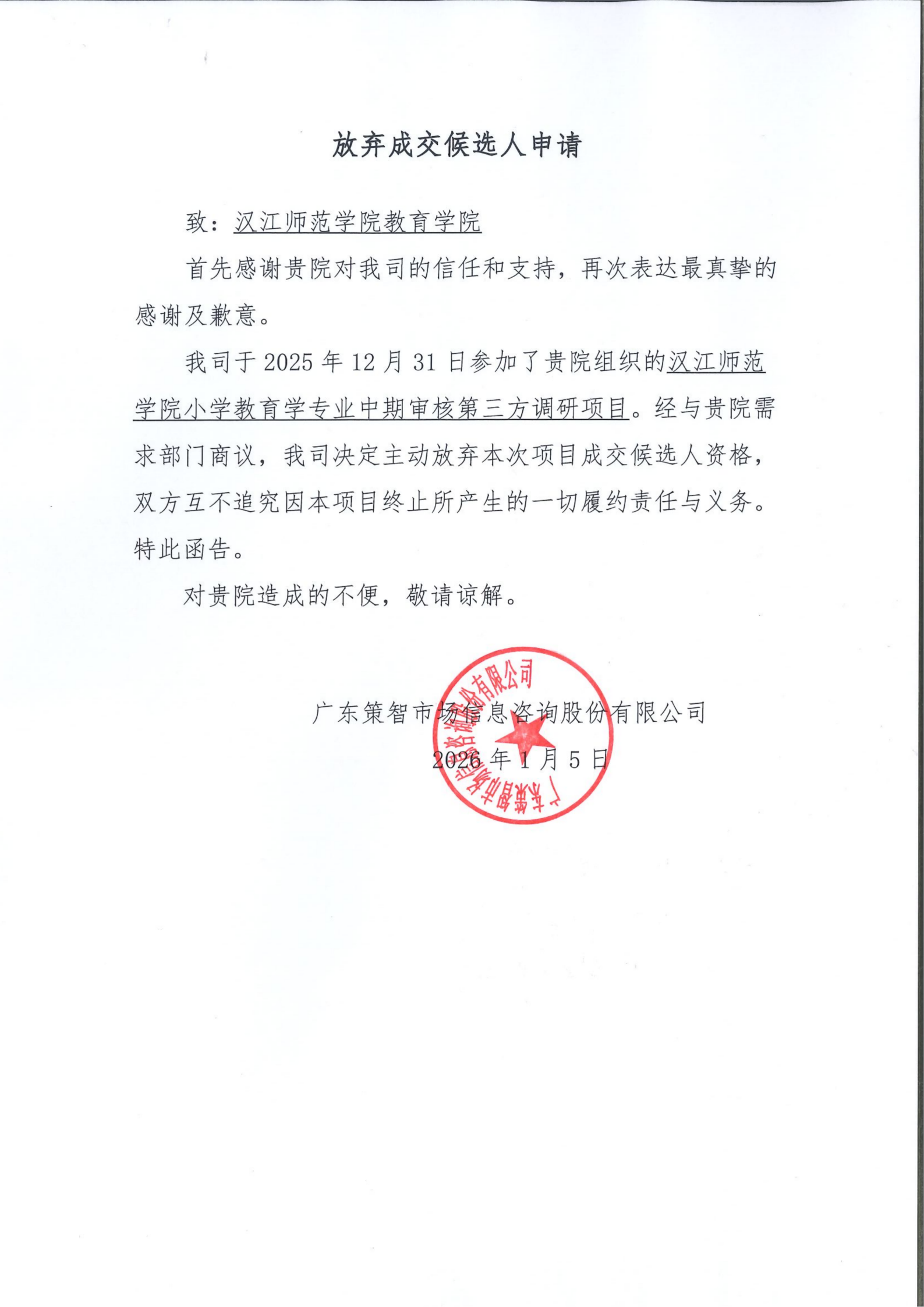汉江师范学院小学教育学专业中期审核第三方调研项目成交候选人弃权公示